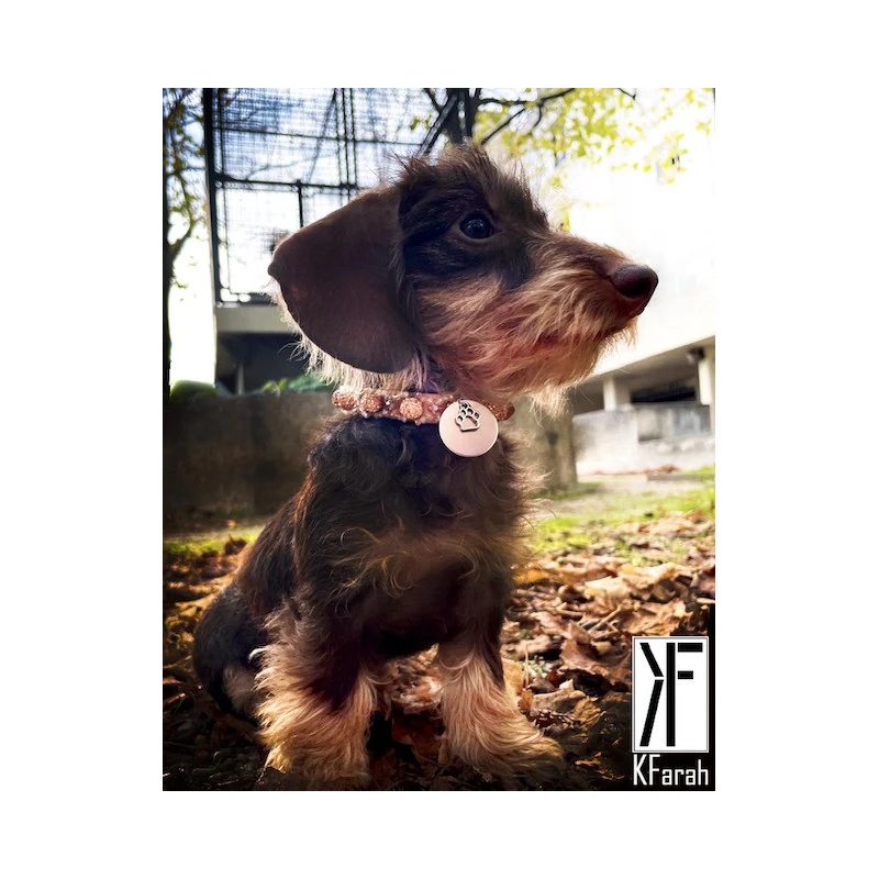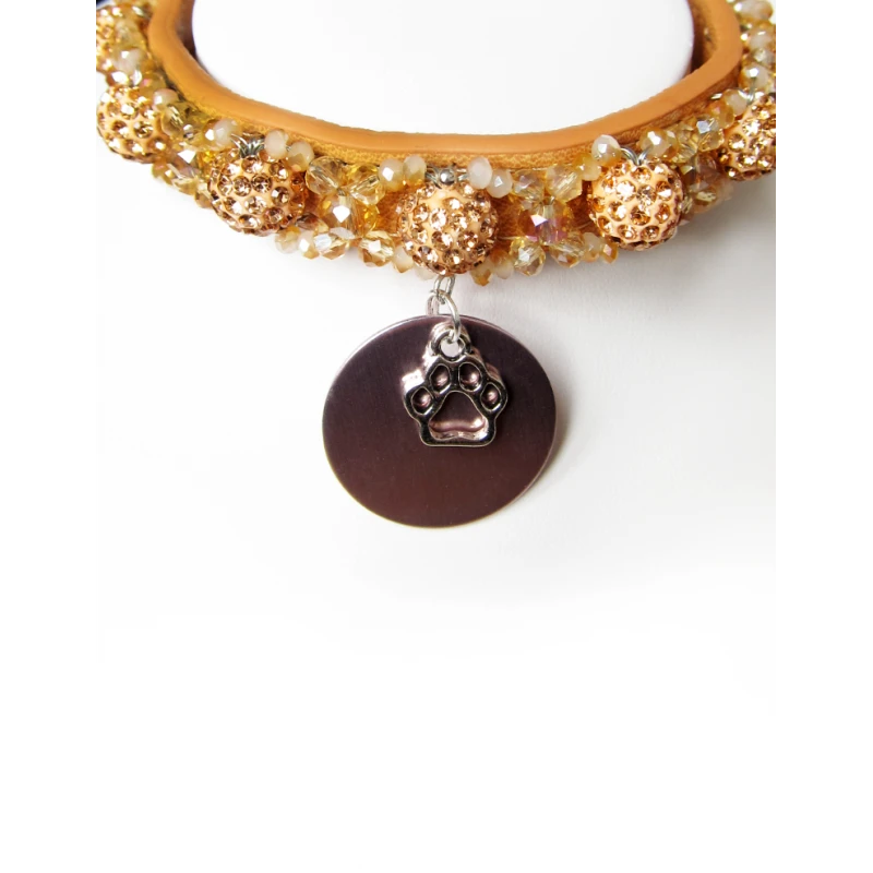 Plaquette nominative au milieu avec breloque en forme d’une patte.