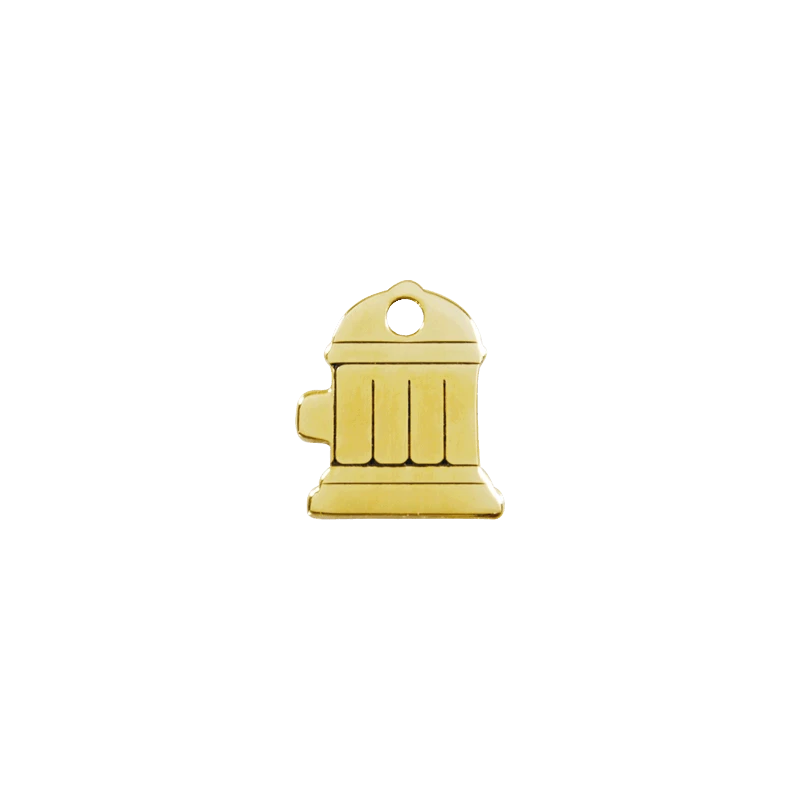 Médaille en laiton pour chien et chat en forme de borne incendie dont le prix comprend la gravure personnalisée recto et verso ainsi qu’un anneau en métal fourni avec la médaille.