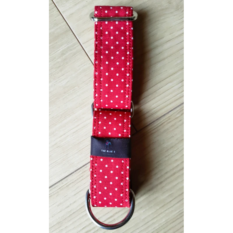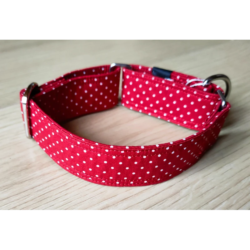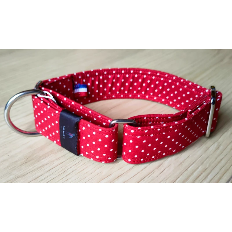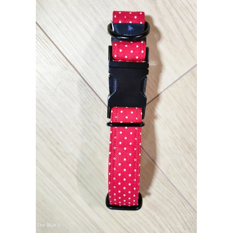 Ce collier est en tissu 100% coton légèrement enduit, impression petits pois blancs sur fond rouge. Il a une base sangle polypropylène.
