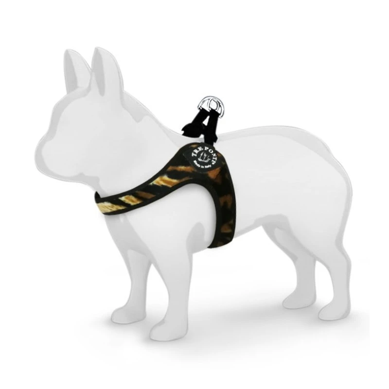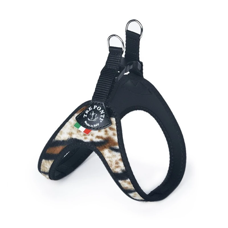 Ce harnais Tre Ponti pour chien est craquant avec sa fourrure sauvage imitation Tigre. Il épouse parfaitement votre animal pour un confort diablement efficace.